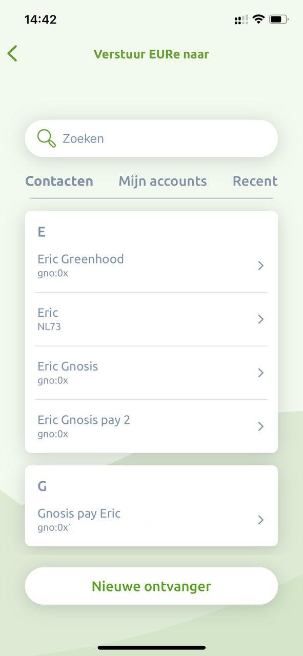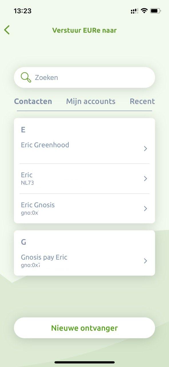 Kies een adres uit je contactenlijst waaronder een IBAN nummer staat. In dit voorbeeld “Eric” waar NL73 bij staat.