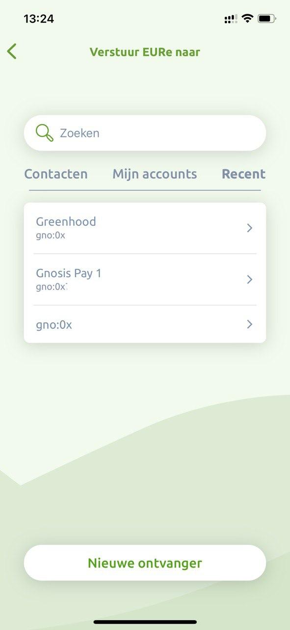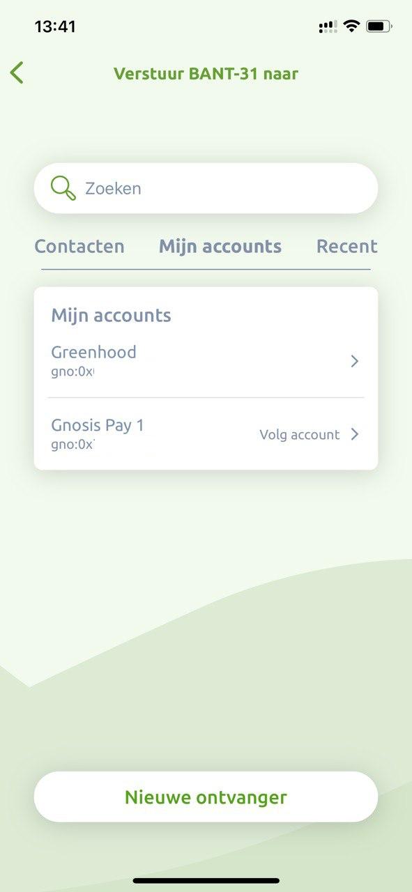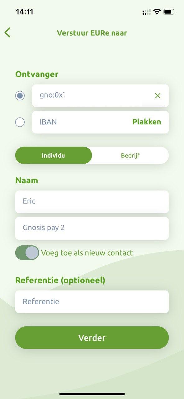 Vul het account adres (“gno: 0x” gevolgd door 42 karakters) van de ontvanger in, en voeg eventueel naam, achternaam en referentie toe. Als je dit adres als nieuw contact wilt bewaren, zet dan het schuifje “voeg toe als nieuw contact” aan. Druk op “verder”.