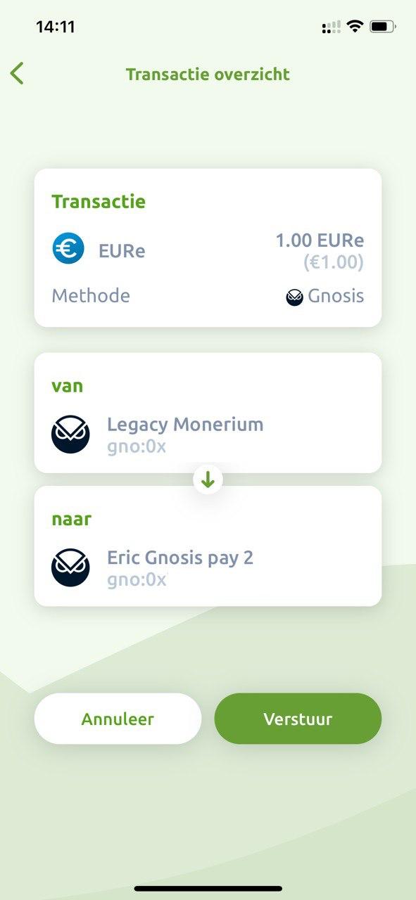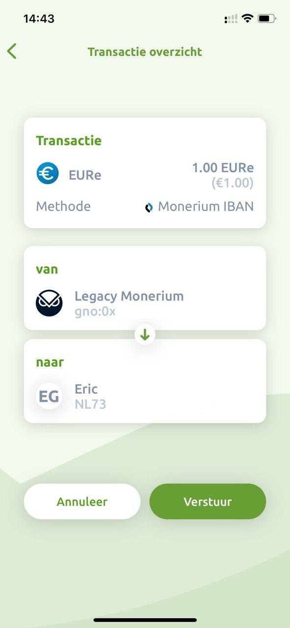 Kies een account dat gekoppeld is aan een Monerium IBAN. Klik op het groene account vlakje in het dashboard. Kies een account waar een IBAN nummer staat onder het Gnosis blockchain adres. Druk in het hoofdmenu op “verstuur”, selecteer een munt (“EURe”) en vul een bedrag in (in dit voorbeeld 1 EURe).